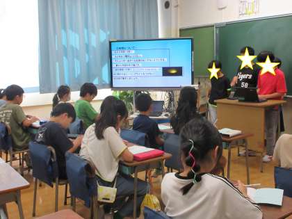 10月に移動教室を予定している5年生に、6年生が移動教室について発表会を行いました。宿舎での生活の仕方や各係の仕事内容などをスライドや紙芝居を使いながら伝えました。発表を聞いた5年生は、移動教室がますます楽しみになっているようでした。