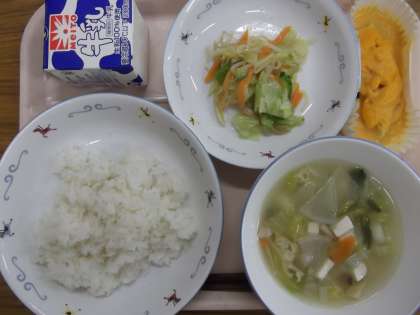 チキンカレーライス、パリパリサラダ、おかしなお菓子な半熟玉子、 牛乳 ※『おかしなお菓子な半熟玉子』のレシピ紹介 https://www.city.nerima.tokyo.jp/kosodatekyoiku... 全校朝礼での表彰