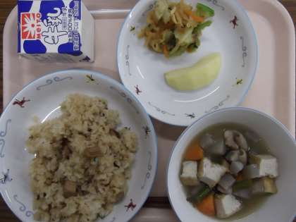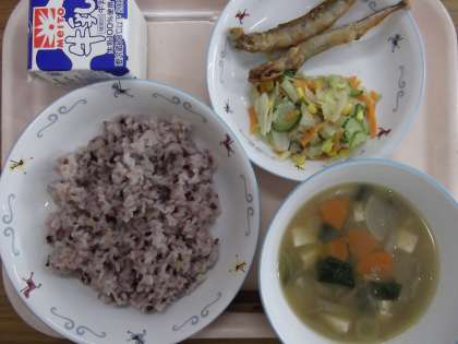五穀かみかみご飯、ししゃものから揚げ、ごぼうサラダ、 みそけんちん汁、牛乳 ※11月8日は日本歯科医師会が定める【いい歯の日】です。 よく噛んで食べることで、次のような効果が期待できます。 1)食べ過ぎを防ぎ、肥満を防止する 2)消化を助け、栄養の吸収がよくなる 3)脳が活性化し、集中力が高まる 11月6日(木)給食
