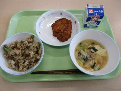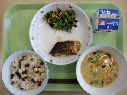 新嘗祭は五穀豊穣の神様に感謝するお祭りでもあります。ここでいう五穀は米、麦、あわ、きび、豆を指します。今日はその5種類を使った五穀ごはんが行事食です。