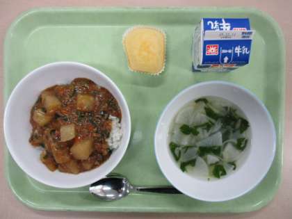 今日の給食は麻婆大根と大根がたくさん入ったスープのルオボータンと大根尽くしの献立になっています。