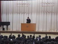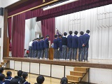 校長のあいさつでは、期末考査とデフリンピック、いじめ防止強化月間、読書の秋、クマのニュース、以上4点について話しました。期末考査については、「試験は、結果よりも、次につながる行動をとることが大事」と伝えました。 また、先月に引き続き、たくさんの表彰がありました。卓球部、野球部、陸上部、バドミントン部、サッカー部、英語学芸会に参加した3年生が表彰されました。個人団体様々な形で賞状をもらうことができ、生徒もうれしそうな表情でした。今後もたくさんの場面で活躍してほしいと思います。 生活指導主任からは、今月の生活目標を伝えました。今月の生活目標は、「学習環境を整え、授業に集中しよう」です。机や黒板などの学習に直結する道具をきれいに保つことだけでなく、チャイム着席を守ることや服装を整えることも大事だと話しました。期末考査もあるので、学習に前向きに取り組んでほしいと思います。 歯科巡回指導
