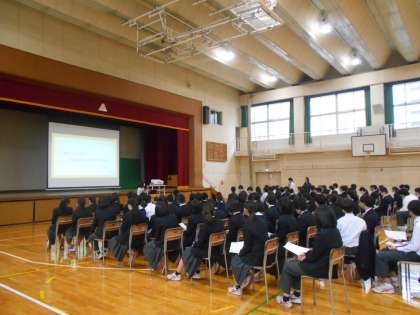 講師の先生をお招きし、がんが発生するメカニズムや予防する方法の講演をしていただきました。実際にがんにかかった方のインタビュー映像なども視聴しました。生徒たちは真剣に話を聞き、がんに対する理解を深めることができました。