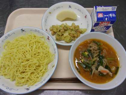 ・青のりポテトビーンズ ・りんご ・牛乳 給食のラーメンは量に合う丼がないため、つけ麺スタイルで 提供しています。 もやしをはじめ野菜がたっぷり入ったピリ辛のスープで お箸がすすみました。 11月16日(日)田柄町会防災訓練