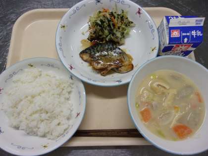 ・さばのソース煮 ・野菜ののり合え ・豆乳仕立てのみそ汁 ・牛乳 さばのソース煮は、ウスターソース、しょうゆ、砂糖などを入れて 作った煮汁で煮付けました。 ウスターソースに含まれる香辛料で深い味わいに仕上がります。 味噌煮とひと味違った煮魚で、美味しかったです。 11月14日(金)の給食