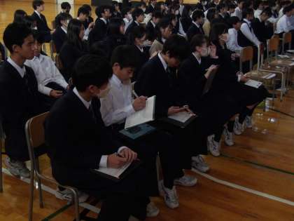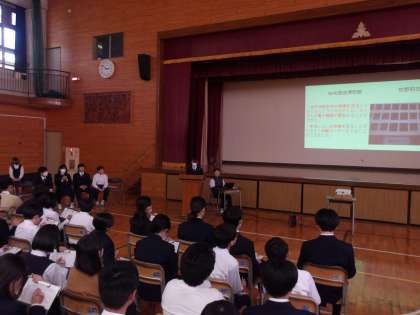 各学級からの代表4班が工夫を凝らした内容で発表しました。発表班以外の生徒たちは、感想を記入していました。