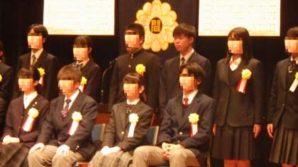 写真上: 1年生の学級委員長より 写真中: 聞いている生徒たちの様子 写真下: 教室に戻ります