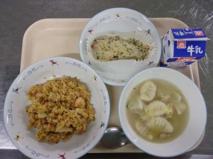 ・じゃがいものチーズオムレツ ・バジルサラダ ・白菜とベーコンのスープ ・牛乳 白菜が多く出回る時期になりました。 この時期の白菜は朝晩の冷え込みで霜に当たることで甘みが増し 葉が柔らかくなります。 今日は練馬区産の白菜を使用しました。 サラダのキャベツとブロッコリーも練馬区産です。 11月21日(金)の給食