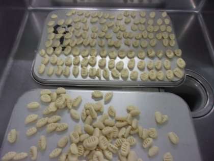 ・魚の香草焼き ・手作りニョッキのスープ ・牛乳 ニョッキはじゃがいも、小麦粉、卵を使って団子状にした イタリア発祥のショートパスタです。 (給食では卵を使用せず作っています) 給食室でひとつひとつ形作り、作りました。 もちもちとした食感とじゃがいもの優しい風味が楽しめました。 11月19日(水)の給食