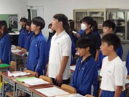 今日は生徒会朝礼をオンラインで行いました。各委員長が2階のひと教室に集まって、そこから配信しました。先週行われた各委員会の活動報告がありました。いよいよ3年生から2年生へのバトンタッチが近づいてきました。