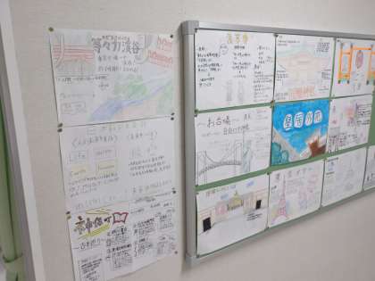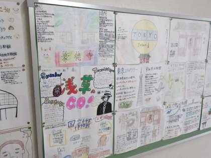 1年生は来月末に校外学習に出かけます。都内を班行動で巡ってきます。そんな1年生のフロアには事前学習で行った東京の文化、歴史、建物、観光地などの生徒作品が掲示されていました。
