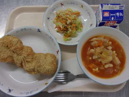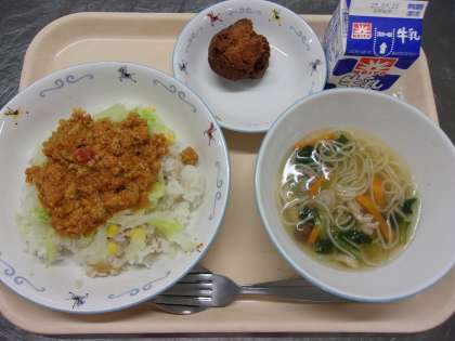 写真上:1年生の教室。もう定期考査に慣れたかな? 写真中:2年生の教室。夏休みの学習の成果が出ますね。 写真下:3年生の教室。進路選択の資料にもなるので緊張感がありましたね。 ![]() ![]() ![]() ![]() ![]() ![]() 9月17日(水)の給食![]() ![]() ・そうめん汁 ・サーターアンダギー ・牛乳 沖縄県の生まれの料理、タコライスを作りました。 チリパウダーを使って少しスパイシーに仕上げた タコミートでご飯と野菜がすすみます。 サーターアンダギーは黒砂糖を使っているので コクのある甘みが感じられました。 残りもなく、よく食べていました! 9月16日(火)の給食![]() ![]() ・根菜入り鶏つくね ・野菜のごま酢和え ・大根のみそ汁 ・牛乳 鶏つくねには粗くみじん切りにしたれんこんと、 ささがきにしたごぼうを入れました。 他にもしいたけやひじきなども入れて、摂りづらい食品も しっかり食べられました。 9月12日(金)の給食![]() ![]() ・チキンサラダ ・ミネストローネ ・牛乳 大人気の揚げパンでした。 甘いパンではありますが。すりごまときな粉を使って 栄養価も高めています。 クラスによっては、粉だけでも!とおかわりしている姿が見られました。 9月11日(木)の給食![]() ![]() ・鯖の味噌煮 ・おひたし ・うすくず汁 ・牛乳 初めて煎り玄米ご飯を作りました。 玄米を煎って香ばしくしたものを一緒に炊き上げています。 鯖の味噌煮は魚料理の中でも特に残りの少ない料理です。 脂ののった鯖と濃厚な味噌でごはんがすすみます。 9月13日(土)練馬区一斉防災訓練(引き取り訓練)