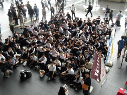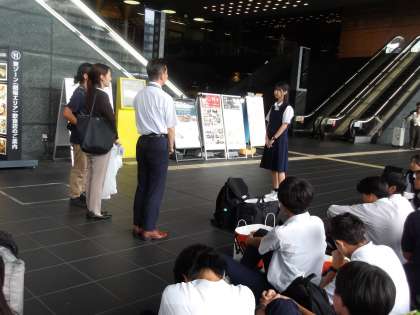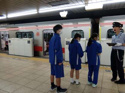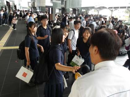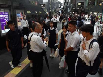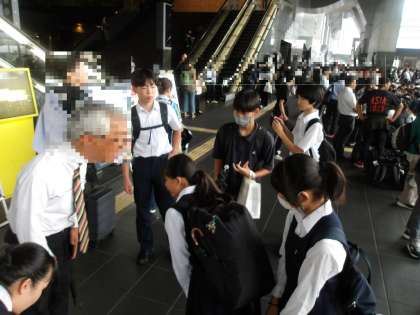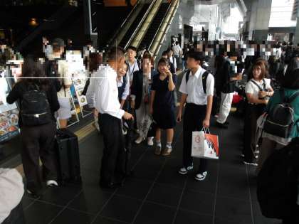 旅行会社のお二人、看護師さん、カメラマンさんに生徒代表によるお礼の言葉です。フォーム移動まで5分間あったので、京都駅で全員を撮影しました。小さいですが、皆笑顔で写っています。そして、フォームに移動して新幹線を待ちました。