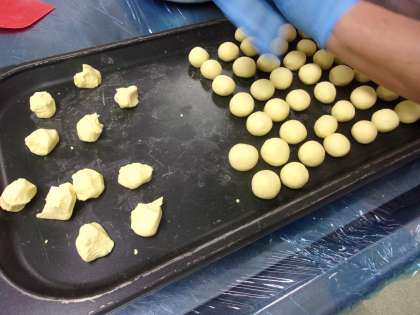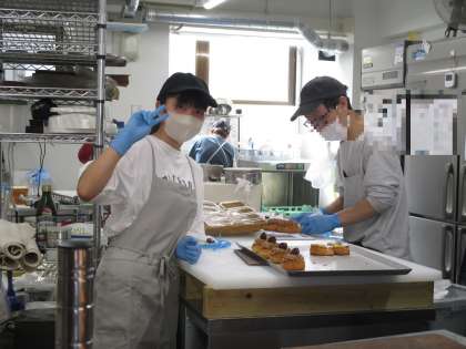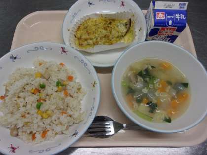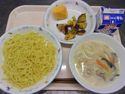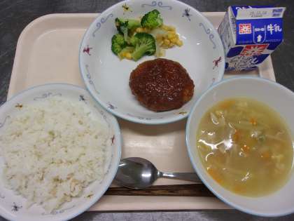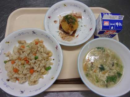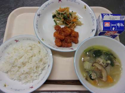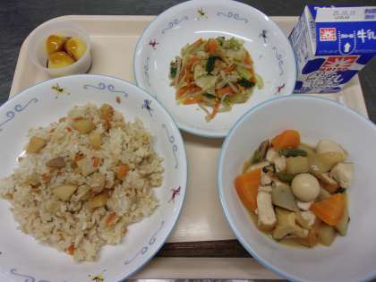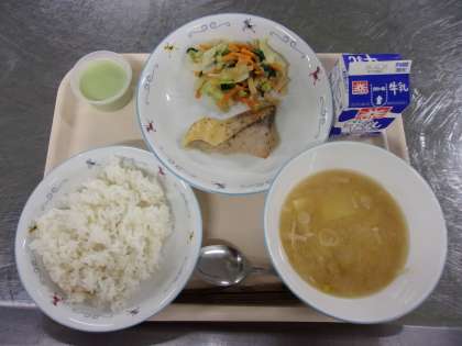 ![]() ![]() ![]() ![]() ![]() ![]() 10月8日(水)の給食![]() ![]() ・大学芋 ・柿 ・牛乳 10月に入り、ようやく涼しくなってきて秋らしくなってきました。 さつまいもの美味しい季節がやってきます。 シンプルに揚げたさつまいもに蜜をからめる大学芋は、 秋を感じるメニューですね。 くだものは和歌山県の紀ノ川農協から産地直送で届いた 種なし柿です。甘くて食感がよく、生徒達もよく食べていました。 10月7日(火)の給食![]() ![]() ・魚のカレーマヨネーズ焼き ・ABCスープ ・牛乳 カレーマヨネーズ焼きには、細かく刻んだ人参やピーマンなどの 野菜とマヨネーズ、カレー粉などをを混ぜたソースを 魚(しいら)にのせ、その上からチーズをかけてオーブンで焼きました。 10月6日(月)の給食![]() ![]() ![]() ![]() ・厚揚げと野菜のうま煮 ・おかか和え ・月見団子 ・牛乳 今年は10月6日は十五夜でした。 それに合わせ、かぼちゃのペーストを入れて黄色く仕上げた 月見団子を作りました。ひとり3個の月見団子は、 一つ一つ同じ大きさになるように作っています。 素早く作業をする様子は、経験を重ねた調理員さん達の 素晴らしい技術です。 10月3日(金)の給食![]() ![]() ![]() ![]() ・ポテトたこ揚げ ・きくらげと卵の中華スープ ・牛乳 昨日今日の2日間は3年生が修学旅行、2年生が職場体験のため 1年生だけの給食です。 こういうときにしか作れない、少し手間のかかるメニューの ポテトたこ揚げを作りました。 蒸してつぶしたじゃがいもの中に、たこ、キャベツ、紅ショウガといった たこ焼きの材料を入れ丸く形作り、たこ焼きならぬたこ揚げにしました。 ソースをかけて青のりと削り節をトッピングすれば完成です。 小さな拳程度の大きさがありボリュームもばっちりです。 食べるときの驚きもあり、楽しい給食になりました。 10月2日(木)の給食![]() ![]() ・煮込みハンバーグ ・ブロッコリーサラダ ・ベジマカロニスープ ・牛乳 煮込みハンバーグは、一度オーブンで焼いたハンバーグを ソースとともに煮込んで作りました。 すりおろしたりんごや赤ワインを入れて作ったソースがポイントです。 ハンバーグに味がしみ、ソースには肉汁が混ざりコクが増し とても美味しく仕上がりました。 10月1日(水)の給食![]() ![]() ・魚の西京焼き ・凍り豆腐と小松菜のおひたし ・じゃがいもと玉ねぎのみそ汁 ・抹茶ゼリー ・牛乳 翌日から3年生が京都・奈良・大阪の関西方面へ修学旅行へ。 それに合わせ、関西地方にゆかりのある食材を取り入れた メニューとしました。 9月30日(火)の給食![]() ![]() ・いかのチリソース和え ・三色ナムル ・春雨スープ ・牛乳 いかのチリソース和えは、にんにく、しょうがなどの香味野菜を炒め 豆板醤やトマトケチャップなどの調味料でチリソースを作り 揚げたいかを和えました。 ごはんの進む美味しい味付けでした。 10月4日(土)修学旅行がもうすぐ終わります
