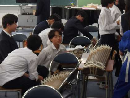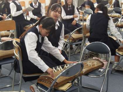 音楽室から純日本風の音が聞こえてきました。そうです、お琴を弾いています。弦をはじく動作がさまになっていました。