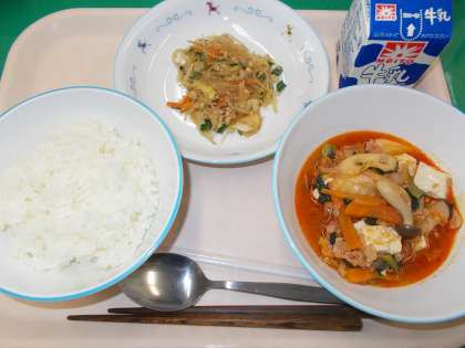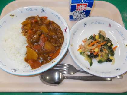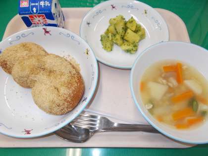 10月15日(水)![]() ![]() カレーライス 牛乳 コーンとツナのサラダ 今日は2日目の「リクエスト給食」です。 今日はごはんの献立No.1に選ばれた「カレーライス」です。 日本のカレーはインドを植民地支配していたイギリス人がインドから自国に持ち帰り、イギリス風にアレンジしたものが日本に伝わり、さらに日本風にアレンジされたものが、今日の「日本のカレー」のルーツとされています。「カレー」がはじめて日本の文献に登場するのは江戸末期ですが、実際に食べられるようになったのは明治のはじめ頃です。 「カレー」の語源には諸説ありますが、インド南部の方言であるタミル語のkariがなまったもの、という説が有力なようです。タミル語でkariとは、「ソース、汁」という意味で、もともとは辛い食べ物ではなかったようです。 10月14日(火)![]() ![]() 揚げパン 牛乳 さつまいもの青のり和え ABCスープ 今日から4日間は「リクエスト給食」が続きます。 第1日目の今日はパンの献立のNo.1に選ばれた「揚げパン」です。 「揚げパン」が給食のメニューとして出されるようになったのは、大田区の公立小学校に勤務する調理師さんが昭和27年に「揚げパン」を作り、学校を欠席した子供の家に届けさせたことがきっかけだと言われています。当時の「学校給食コンクール」での優勝経験もあるこの調理師さんは、作ってから時間が経過して硬くなってしまったパンをおいしく食べられるようにと考え、「揚げパン」を作ったようです。甘い食べ物を手に入れることが困難だったこの時代、子供たちにとっては「揚げパン」がごちそうに思えたことでしょう。それから今までずっと、給食の人気メニューのひとつになっています。 10月11日(土)は授業公開です!