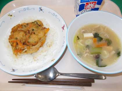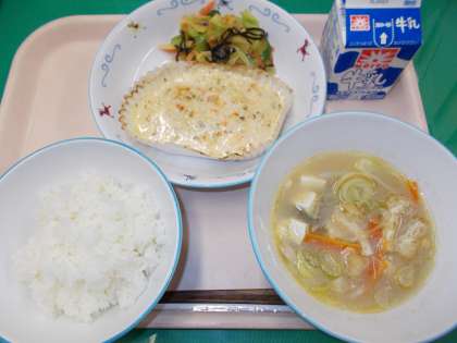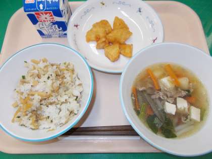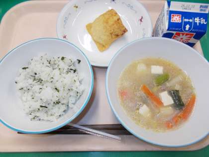牛乳 生揚げと根菜のみそ汁 今日の「みそ汁」に使用している「生揚げ」は基本的には「木綿豆腐」を高温の油で揚げて作ります。高温の油で揚げることで表面はきつね色になりますが、中心までは火が通らず、生の木綿豆腐のままになっていることが特徴です。「生揚げ」という名前は、中が生のままであることから付けられました。油で揚げた「生揚げ」は香ばしさが加わり食べごたえがあります。また、表面がこんがり揚がっていることで、崩れにくく調理がしやすいこともポイントです。 「厚さ」をくらべて、「薄揚げ」「厚揚げ」と呼ばれることもあります。「薄揚げ」は油揚げのことで、「厚揚げ」は生揚げの事です。 今日は生揚げと根菜の入った、「具だくさんのみそ汁」を作りました。 11月11日(火)