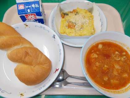 牛乳 かぼちゃのグラタン ミネストローネ 「ミネストローネ」は、イタリアの代表的な具だくさんの野菜スープです。イタリア語で「具沢山」や「ごちゃ混ぜ」といった意味を持ち、日本の味噌汁のように各家庭で親しまれている家庭料理です。使う野菜は季節や地方によって異なり、冷蔵庫にある様々な食材を入れて作られます。豊富な野菜がたっぷり使われ、ベーコンやショートパスタ、米などが加えられることもあります。味付けは野菜をオリーブオイルで炒めてから煮込み、コンソメやトマトで味付けされることが一般的です。トマトは南アメリカ原産ですが、イタリアに渡って広く栽培されるようになり、「ミネストローネ」にも欠かせない食材となっています。野菜が豊富で栄養価が高く、「食べるスープ」として一皿で多くの栄養素を摂取できるため、イタリアの人々の健康を支える料理とも言われています。 11月17日(月)
