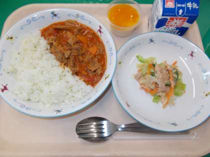 牛乳 手作りりんごジャム パンプキンオムレツ チキンと野菜のトマトスープ 「10月31日」は「ハロウィン」です。今日の給食はカボチャを使った「ハロウィン献立」です。カボチャの目と口と鼻をくり抜いて、中にキャンドルを灯したカボチャのランタンは「ハロウィン」の定番シンボルです。ランタンとはどこかに掛けたり、手でぶら提げたりして使用する、吊りさげ型移動式照明器具のことです。 「ハロウィン」は、毎年10月31日に行われるヨーロッパ発祥のお祭りで、もともとは、秋の収穫を祝い、悪霊を追い出す宗教的な意味合いのある行事でした。魔女やゴースト、ゾンビ、ドラキュラ、ガイコツなど、恐ろしい怪物やお化けに仮装し、悪霊を怖がらせて追い払うのが昔からの習わしとなっています。 日本では、「ハロウィン」の本来の意味よりも、仮装を楽しむことに重点を置く人々が大変多くなっています。 10月30日(木)