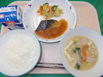 牛乳 白身魚の彩り焼き 野菜の塩昆布和え みそけんちん汁 今日の献立の「野菜の塩昆布和え」の「塩昆布」とは、昆布を濃口醤油を主体とした調味液で煮詰めていった物のことを指します。 その歴史は古く、平安時代にはすでに今の「塩昆布」に通ずるレシピが存在していたといいます。 昆布には「グルタミン酸」と言う栄養成分が含まれているため、うまみを感じます。また、この「グルタミン酸」に加えて塩を入れることによって 対比効果により、「グルタミン酸」のうまみがより一層際立ちます。砂糖などを加える場合、更なる味の相互作用が生まれます。醤油を加えて作る場合は、醤油の「グルタミン酸」や「アスパラギン酸」や糖分や酸味や苦味なども加わりうまみが一層引き立ちます。 「野菜の塩昆布和え」には昆布が入っているので、うまみがよくでていて、美味しい和え物になっています。 11月21日(金)