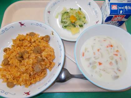 牛乳 根菜の洋風スープ 「チリソース」とはトマトソースに唐辛子やスパイスが入った「ソース」のことです。 唐辛子の辛み成分である「カプサイシン」は、体を温めて血の巡りをよくしてくれる働きがあります。チリソースの「チリ」は、国の名前のチリからきています。定番のチリソース料理と言うとエビチリですが、エビ以外にも、白身魚や鶏肉、ナスなど肉・魚・野菜どの素材を揚げても美味しく「チリソース」が仕上がります。揚げ物に絡めるソースとしてだけでなく、チャーハンに「チリソース」を加えれば「ナシゴレン」にもなりますし、鶏のから揚げの下味に「チリソース」を入れたり、ポテトフライのソースにするとエスニックな料理に様変わりします。「タコライス」のタコミートに入れれば、より本格的な「タコライス」を味わうことができます。 今日は「ターメリックライス」の上に「チリソース」をかけて、「チリソースライス」を作りました。 11月28日(金)