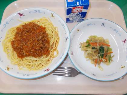 牛乳 じゃこ入りサラダ 「ミートソース」とは、ひき肉に炒めた香味野菜、トマトピューレや香辛料などを加えて煮込んだソースです。ひき肉が入ったソースという意味がある「ミートソース」は、スパゲティなどのパスタと合わせて食べることが多いものです。そんな「ミートソース」とよく似た料理に「ボロネーゼ」があります。「ボロネーゼ」とは、ボローニャの、またはボローニャ風という意味を持つ言葉で、その名の通りイタリアのボローニャ地方で生まれたソースの名前です。 日本に「ミートソース」が伝わったのは、1870年代の頃です。イタリア人コックが新潟のホテルに開業したレストランの「ミートソース」が、日本で初めて提供された「ミートソース」といわれています。日本ですっかり定着している「ミートソース」ですが、元々はイタリアの「ボロネーゼ」がアメリカに伝わったものが、日本人向けにアレンジされたものです。 11月25日(火)