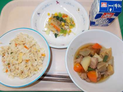 牛乳 キャベツとコーンの炒め物 筑前煮 日本の伝統的な料理の1つである「筑前煮」はおそらく、誰もがその名前を1度は耳にしたことがあるのではないでしょうか。「筑前煮」とは、鶏肉と野菜、こんにゃくなどを油で炒め、甘辛く味付けした煮物で、福岡県の北部・西部の筑前地方の郷土料理です。具材を「油で炒めてから煮る」という作り方が、筑前地方独特のものであったことが、名前の由来だとされています。「筑前煮」という名前は、一般的には「筑前地方以外の地域」で使われる呼び方です。ほかには「筑前炊き」や「いり鶏」などとも呼ばれ、正月料理など祝いの席では欠かせない料理として知られています。全国の学校給食で郷土料理として提供されるようになったことから徐々に全国に浸透し、今や日本の家庭料理の定番となりました。 11月26日(水)
