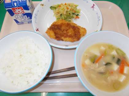 牛乳 白身魚のフライ キャベツときゅうりの和え物 こしね汁(群馬) からっとした群馬県富岡市の天候では、湿気を好まないこんにゃくや原木栽培によるしいたけ、太くて立派な下仁田ねぎなどが良く育ちます。そこで富岡市婦人会連合会がこれらの農畜産物がたっぷりと入った汁物の郷土料理を考案し、「こんにゃく」「しいたけ」「ねぎ」の頭文字を取り、「こしね汁」と名付けたのです。 群馬県は「こんにゃく」と「原木しいたけ」の生産量が日本一で、「ねぎ」は「下仁田ネギ」が、加熱すると強い甘みと滑らかなとろみが出て、大変人気があるので、これらの食材が選ばれたようです。2001年(平成13年)から群馬県の学校給食にも取り入れられるなど、地域に根付いた料理となっています。 「こしね汁」は野菜嫌いの子どもでも野菜を多く食べられるように作られた「食べるみそ汁」なのです。 12月3日(水)