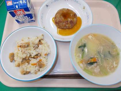 牛乳 つくね焼き 具たくさん東京味噌汁 「深川飯」とは、東京都の深川に由来する郷土料理で、大きくは「ぶっかけ」と「炊き込み」の2種類があります。元々は、江戸時代に漁師たちが手軽に栄養を摂るために、ネギと生アサリを味噌で煮て、熱いご飯に汁ごとぶっかけた「ぶっかけ」タイプが発祥です。その後、明治時代に大工などの職人が持ち運びやすいように、アサリのむき身をご飯と一緒に炊き込んだ「炊き込み」タイプが生まれました。江戸の埋め立てが進み、深川周辺での漁業が衰退したことで、「深川飯」も食べられる機会が減ってしまいました。しかし、近年になって深川エリアの飲食店の取り組みなどにより、再びこの郷土料理が復活し、各地で提供されるようになりました。今日の給食では、「炊き込み」タイプに近い、混ぜご飯で「深川飯」を作りました。 |