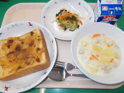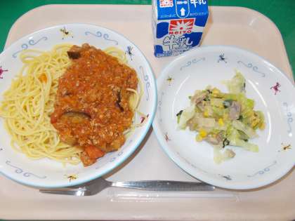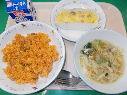 牛乳 スペイン風オムレツ バミセリスープ 「オムレツ」は、16世紀フランスで「オムレット」と呼ばれていました。日本に伝わった際に訛って、「オムレツ」と呼ばれるようになりました。「オムレツ」はフランス語で「剣」を意味し、ギリシャ語が由来と言われています。「オムレツ」の形状が剣に似ているところからその名がついたそうです。諸説ありますが、昔お腹を空かせたフランスの王様が「なんでもいいから何か早く作って。」と言った時に、ある男の人が、卵を溶いてフライパンで焼いたものを出したのが始まりだそうです。 今日の給食の「オムレツ」はスペイン風オムレツまたは、トルティージャと言われている「オムレツ」で、卵、じゃがいも、タマネギなどの具材がたっぷり入った厚みのある「オムレツ」です。 9月25日(木)