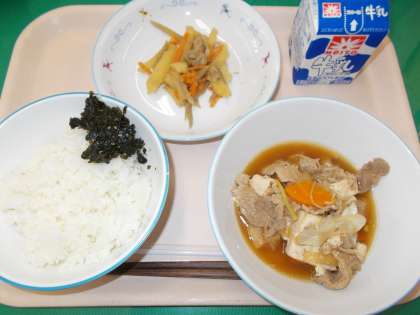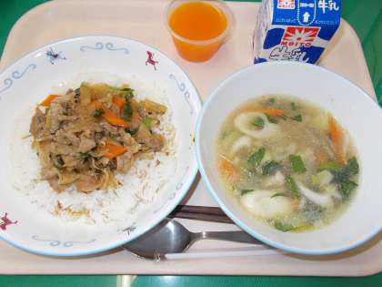 牛乳 具だくさん味噌汁 ミックスオレンジゼリー 「高野豆腐」は、別名「凍り豆腐」とも呼ばれています。豆腐を凍らせてから熟成、解凍、脱水、乾燥させる独特の製法で作られている日本の伝統食品です。豆腐に含まれるたんぱく質や脂質をそのまま保持しており、とくに植物性たんぱく質やカルシウム、鉄分、食物繊維が豊富なところが魅力です。食後の血糖値上昇や血中中性脂肪値上昇、血中コレステロール値上昇の抑制に効果的というデータもあり、生活習慣病対策につながるスーパーフードとして注目を集めています。 また、常温で長期保存が可能で、いざというときの非常食としても重宝できる食材です。 今日の給食では「高野豆腐」と豚ひき肉でそぼろを作り、甘辛く味付けをして丼の具を作りました。給食の人気メニューの一つです。 9月30日(火)