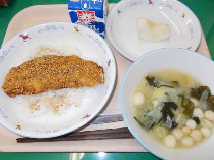 牛乳 玉ねぎと豆麩の味噌汁 果物 今日の果物は「梨」です。現代の日本の梨のルーツは、日本原産の「日本なし」です。今から1000年以上前に書かれた『枕草子』には梨の花の話題が登場し、江戸時代には既に100種類を超える品種があったといわれます。古くから日本人の生活に寄り添い、愛されてきた果物ですね。 「梨」は美容や健康に良い果物で、水分や食物繊維、ビタミンやミネラルなどの栄養素が含まれています。梨を食べることで便秘や高血圧、むくみなどの改善や予防が期待できるほか、梨に含まれるビタミンCやポリフェノールは老化防止にも効果的です。さわやかな甘さ、みずみずしくてシャリシャリとした独特の食感が魅力の梨は、カロリーも低く、秋の食後のデザートに最適の果物です。 9月26日(金)