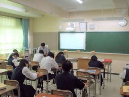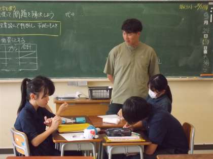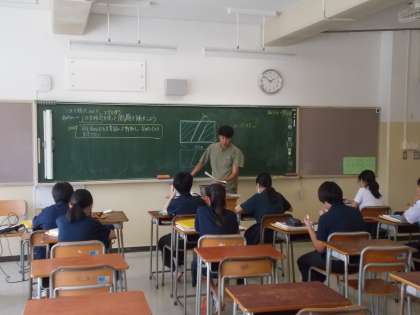 牛乳 ポテトクリーム煮 大根とわかめのサラダ 今日の給食のサラダに使用されている「わかめ」の特徴は、低カロリーながらビタミン・ミネラル・食物繊維を豊富に含む栄養価の高さです。特にヨウ素、カルシウム、マグネシウムなどのミネラルが豊富で、成長を助け、骨や歯を丈夫にします。 日本人が生わかめや生海苔などを消化できるのは、日本人の腸内細菌が、海藻の硬い細胞壁を分解する特別な酵素を作る遺伝子を持っているためです。この遺伝子は、海藻を食べる食習慣が長かったことによって、腸内細菌が海洋性の微生物から取り込んだと考えられています。他の国の人々にはこの能力がない場合が多く、消化が難しいとされていますが、海苔は加熱さえすれば細胞壁がこわれ、消化されやすいので、海外では「SUSHI」として海苔巻き寿司が食べられており、海藻はヘルシーでダイエットに最適だとされています。 3年生の数学の授業の様子