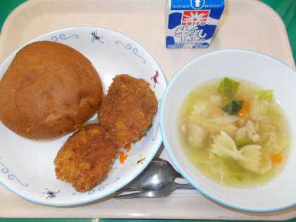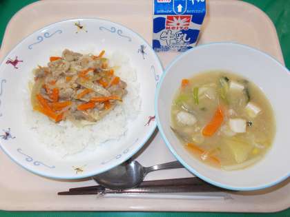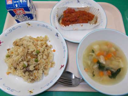 牛乳 生揚げと根菜のみそ汁 今日の「みそ汁」に使用している「生揚げ」は基本的には「木綿豆腐」を高温の油で揚げて作ります。高温の油で揚げることで表面はきつね色になりますが、中心までは火が通らず、生の木綿豆腐のままになっていることが特徴です。「生揚げ」という名前は、中が生のままであることから付けられました。油で揚げた「生揚げ」は香ばしさが加わり食べごたえがあります。また、表面がこんがり揚がっていることで、崩れにくく調理がしやすいこともポイントです。 「厚さ」をくらべて、「薄揚げ」「厚揚げ」と呼ばれることもあります。「薄揚げ」は油揚げのことで、「厚揚げ」は生揚げの事です。 今日は生揚げと根菜の入った、「具だくさんのみそ汁」を作りました。 11月11日(火)