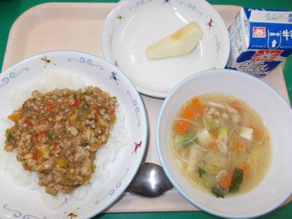 牛乳 青梗菜とじゃが芋のスープ 果物 「ガパオライス」は、タイ発祥のバジル炒めをご飯にのせた料理です。日本語では「バジル炒めご飯」と訳されます。正式なタイ語名は「パット・ガパオ」です。「ガパオ」とは主要な材料であるハーブの「ホーリーバジル」を指します。鶏肉や豚肉などのひき肉と、「ホーリーバジル」を一緒に炒めます。ナンプラー、オイスターソース、砂糖、唐辛子、ニンニクなどでピリ辛に味付けされ、甘辛くスパイシーでエスニックな風味が特徴です。「ガパオライス」の味の決め手となるナンプラーですが、塩漬けにした魚を発酵することでできる調味料です。「ガパオライス」はタイでは非常にポピュラーな家庭料理や食堂料理として親しまれています。 日本で「ガパオライス」を作る時は「ホーリーバジル」が手に入りづらいので、「スイートバジル」で代用されることも多いです。 11月12日(水)
