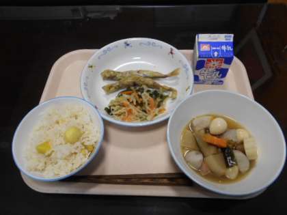 栗おこわ、ししゃもの磯部揚げ、わかめと切り干し大根のごま和え、ミニカットおでん、牛乳