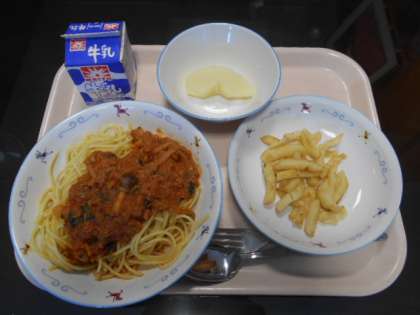 ツナのトマトソーススパゲティ、スパイシーポテト、りんご、牛乳