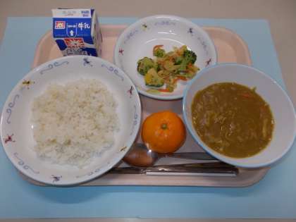 秋のカレーライス、ブロッコリーのごまサラダ、くだもの(みかん)、牛乳