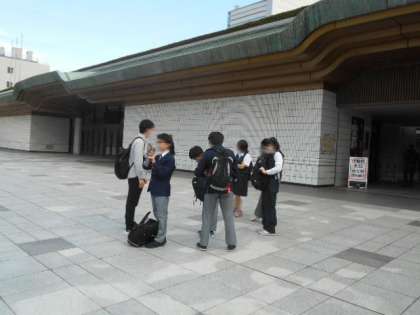 F組1班に両国国技館の相撲博物館で会いました。ここを見学した後は隅田川周辺の散策を兼ねて、浅草まで歩きます。蔵前橋・厩橋・駒形橋・吾妻橋、どこで渡るかはみんなで相談して決めました。厩橋を渡って対岸に行き、隅田川沿いに歩いて浅草に到着しました。これから予定していた昼食場所に向かい、お昼を食べた後に浅草見学です。