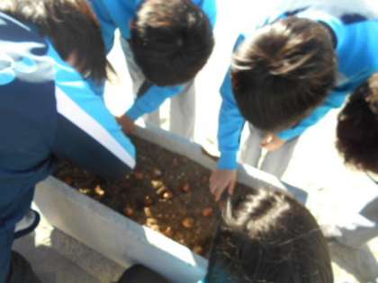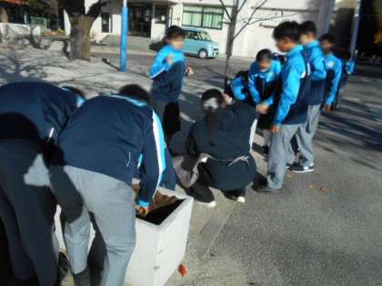 学校の緑化活動の一環として、F組の生徒たちがチューリップの球根を植えてくれました。校庭にある8個のプランターに、色とりどりの球根を、植え方などデザインも考えながら植えていきました。冬の寒さを土中で過ごし、春にはきれいな花を咲かせてくれるでしょう。今からとても楽しみです。