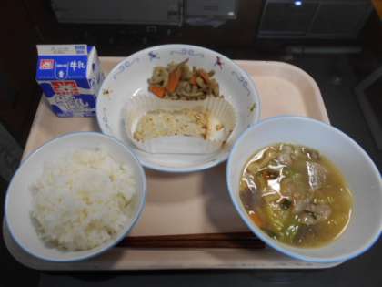 ご飯、サメのマヨネーズ焼き、ごぼうとレンコンのきんぴら、さつま汁、牛乳