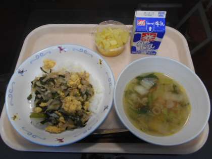 中華ニラ卵丼、きくらげ入り中華スープ、フルーツきんとん、牛乳