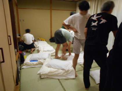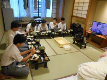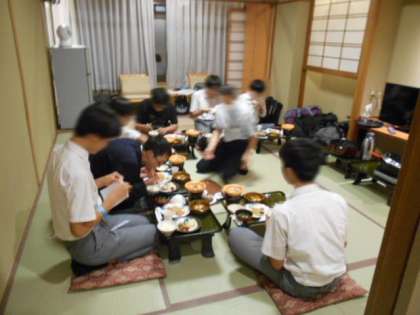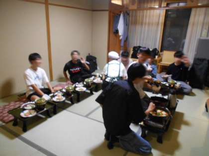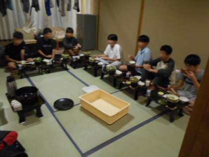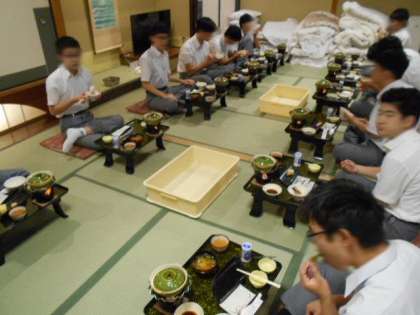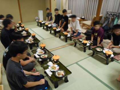 宿舎に着いて、直ちに部屋に入り、破損チェックや貴重品集めなどを行います。食事係は夕食準備のお手伝いです。そしていよいよ夕食です。今日はたくさん歩いたのでお腹も空いたでしょう。豪華なメニューで部屋食です。たくさん食べて明日に備えてください。