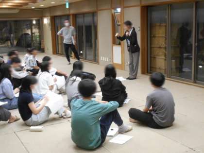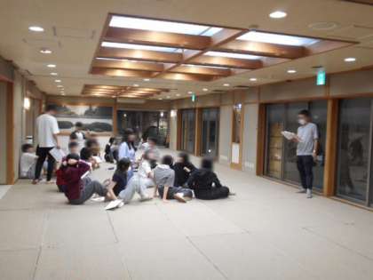本日の締めくくり、1階広間で室長&班長会です。明日の班行動に向けて、様々な諸注意や、添乗員から1日乗車券についての説明です。健康カードについての説明もありました。この後、部屋に戻って部屋会議と就寝準備です。