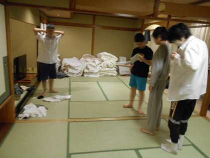 朝6:00、起床時間です。さわやかな英語のモーニングコールとともに起きます。寝具の整理、検温し健康カードの記入と提出、洗顔、着替えといつでも出発できる準備をします。早い部屋もあれば、まだ布団から出られない人もいるようです。