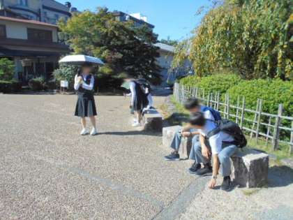 丸山公園、疲れたのか休んでいる班もあります。これから建仁寺や安井金比羅宮に向かうそうです。