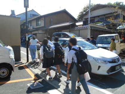 京都の街中で班行動中の生徒と遭遇、四条河原町でバス停を探していました。下賀茂神社に向かうそうです。