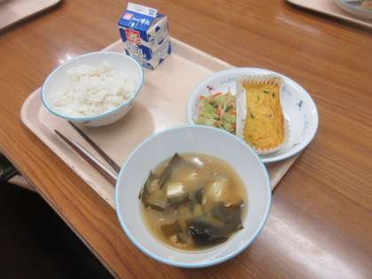 麦ごはん、そぼろ入り厚焼き玉子、キャベツのごま酢あえ、みそ汁、牛乳 今日から今週いっぱい“図書コラボ給食”週間です。第1日目は額賀澪さんの「タスキメシ」とのコラボです。24ページに出てくるメニューが使われているとのことでした。 そぼろ入り厚焼き玉子は、ひき肉、ひじき、グリンピースなどが入っていて、甘い味付けでした。キャベツのごま酢和えは、もやし、キュウリも入ってさっぱりしていてこちらもおいしいです。今日のみそ汁の具は豆腐、ワカメ、ジャガイモ、玉ねぎが入ったみそ汁でした。子どもの頃、母が作ってくれたみそ汁を思い出しました。思わず“お母さ〜ん”とみそのコマーシャルのように叫びたくなりました。