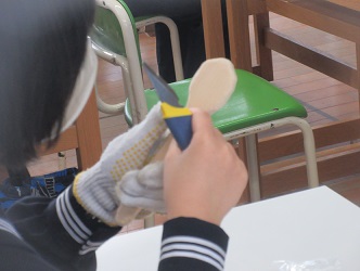 26日(水)2時間目、美術室を覗くと1年生が一生懸命木を削り、紙やすりで磨いていました。木を使ってスプーンを製作する授業です。みんな無口になり、一心不乱に作業に取組んでいます。細かい角の曲線や滑らかな曲線、唯一無二の作品が出来上がりそうです。彫刻刀などでケガをしないように軍手をはめての作業です。どんな作品になるのか楽しみです。出来上がりは作品展に展示されます。お楽しみに!!