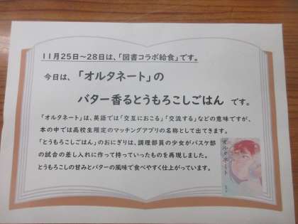 バター香るとうもろこしごはん、揚げごぼう、タイピーエン、牛乳 今日のコラボ図書は元newsの加藤シゲアキさんの「オルタネート」です。その中に登場するバターとうもろこしごはんがメインです。コーンとバターの甘さ、コクが一緒になってberry deliciousです。ごはんがアツアツだとさらに旨さが引き立ったのではないかと思います。